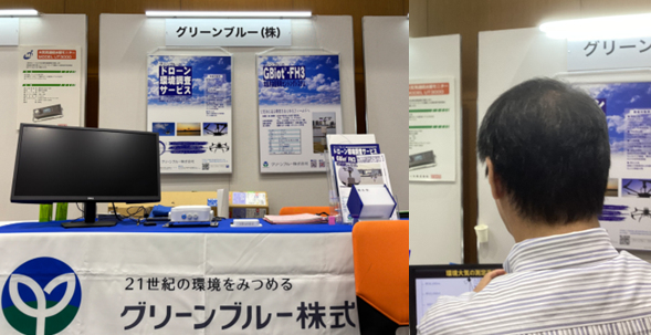 ブースでは、ドローンの環境調査サービスと上記③で使用したGBiot-FH3のパネル展示、上記①②で使用中の車内外のGBiotを展示したほか、ディスプレイではドローンの環境調査サービスや総務省研究開発委託での実証の様子を示した動画を紹介しました。