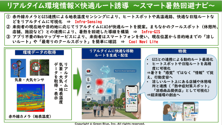 近年深刻化する都市部の暑熱問題に対し、弊社が取り組むリアルタイムでの環境情報可視化ソリューション(AI技術を活用して暑さを可視化し、人々へ快適な移動ルートを提案)につき、実証実験構想を交えながらご紹介いたしました。
